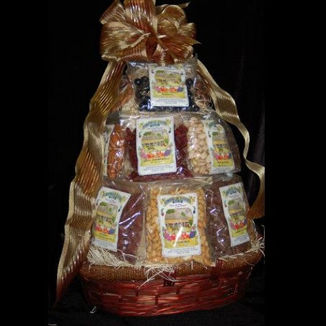 This is the ultimate gift for any office or family. It contains a wide array of items including: Chocolate raisins, chocolate blueberries, yogurt raisins, almonds, pistachios, dried cranberries, pecans, pumpkin seeds, chocolate cherries, dried cantaloupe, walnuts, chocolate apricots, pineapple, papaya, toffee peanuts, chocolate almond clusters, yogurt almonds and cashews.