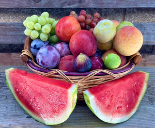 Grapes, Plums, Pluots, Fuyu Persimmons, Hachiya Persimmons, Asian Pears, Pomegranates, Apples, Yams, and Onions